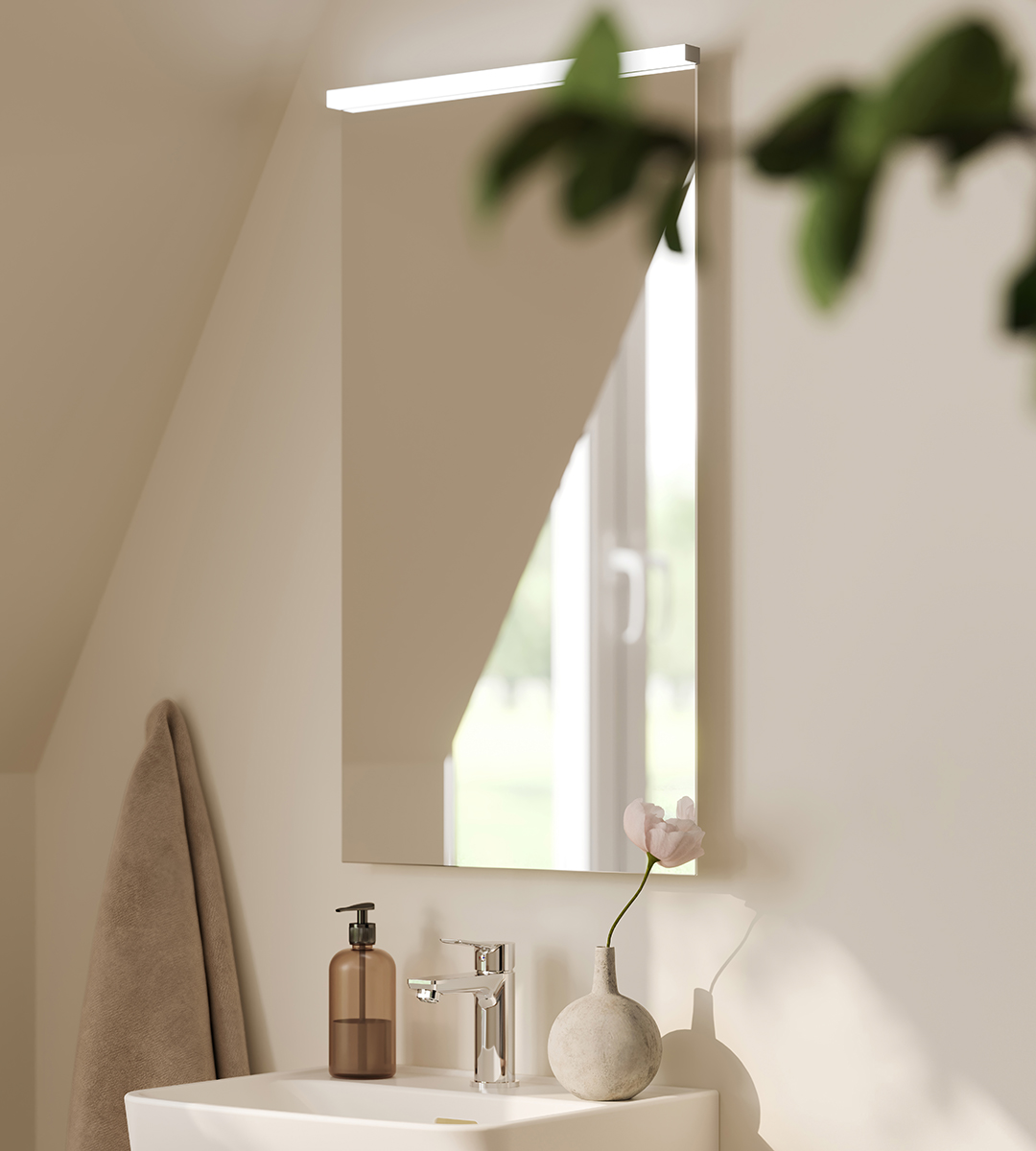 Spegeln Hov kombinerar modern design med smart funktion. Med ljusstyrning på sidan kan du enkelt anpassa ljusstyrka och färgtemperatur för att hitta rätt stämning och ljus i badrummet