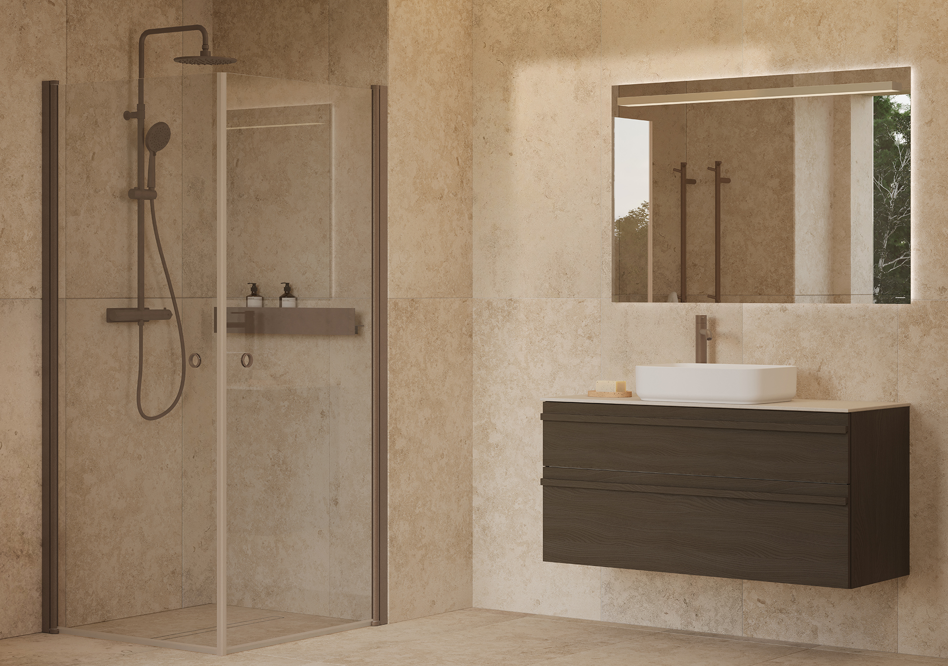 Rae är en elegant spegel med mjuk bakgrundsbelysning som skapar ett behagligt och stämningsfullt ljus i badrummet. Dessutom har den integrerad nedåtriktad funktionsbelysning som ger extra ljus där du behöver det.